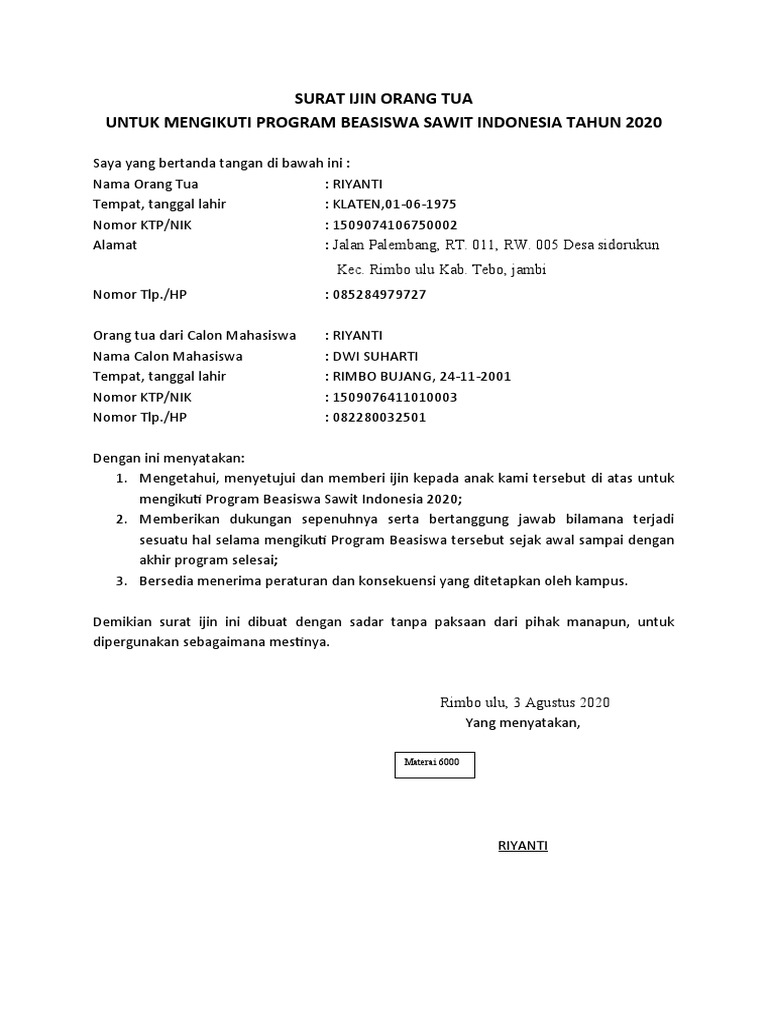 Surat Ijin Orang Tua Docx : Snbsi 2020 Peserta Umum. Surat ijin orang tua/suami/istri adalah surat yang digunakan/dikeluarkan untuk melengkapi persyaratan melamar pekerjaan baik di dalam negeri maupun di luar negeri, surat ijin orang tua apabila yang bersangkutan belum berkeluarga. Lalu apa yang kamu lakukan? Dalam kondisi ini kamu perlu membuat surat izin orang tua yang menyatakan. Banyak pilihan sekolah baik negeri maupun swasta dengan program unggulan. Walaupun sudah tersedia berbagai komunikasi canggih dan modern sekarang menulis surat izin dari orang tua tidaklah begitu susah dan mungkin sudah merupakan hal yang biasa bagi sebagian orang.